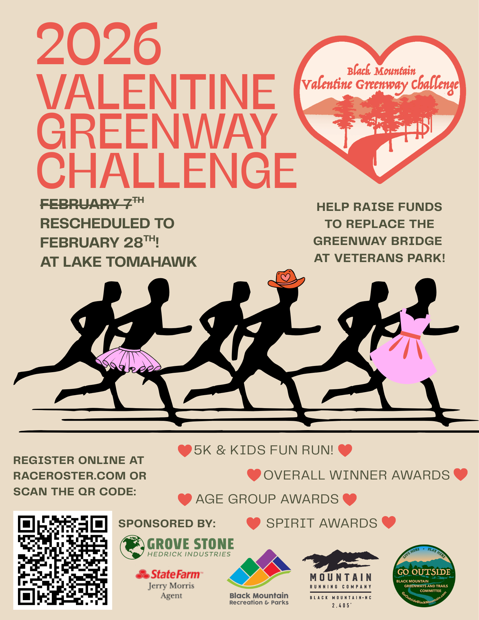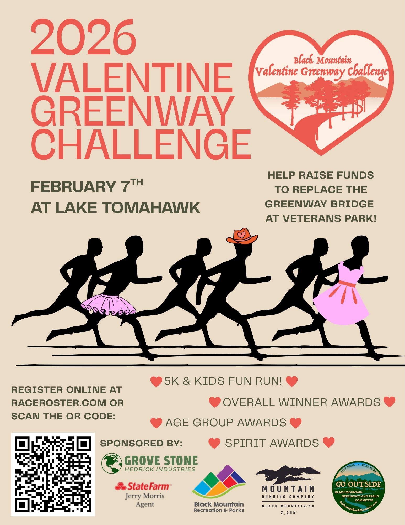 This year's race has a goal of raising $50,000 to go towards replacing the greenway bridge along the Oaks Trail at Veterans Park that was swept away by Tropical Storm Helene. Interested runners and walkers can learn more and register here: https://raceroster.com/events/2026/112664/2026-valentine-greenway-challenge