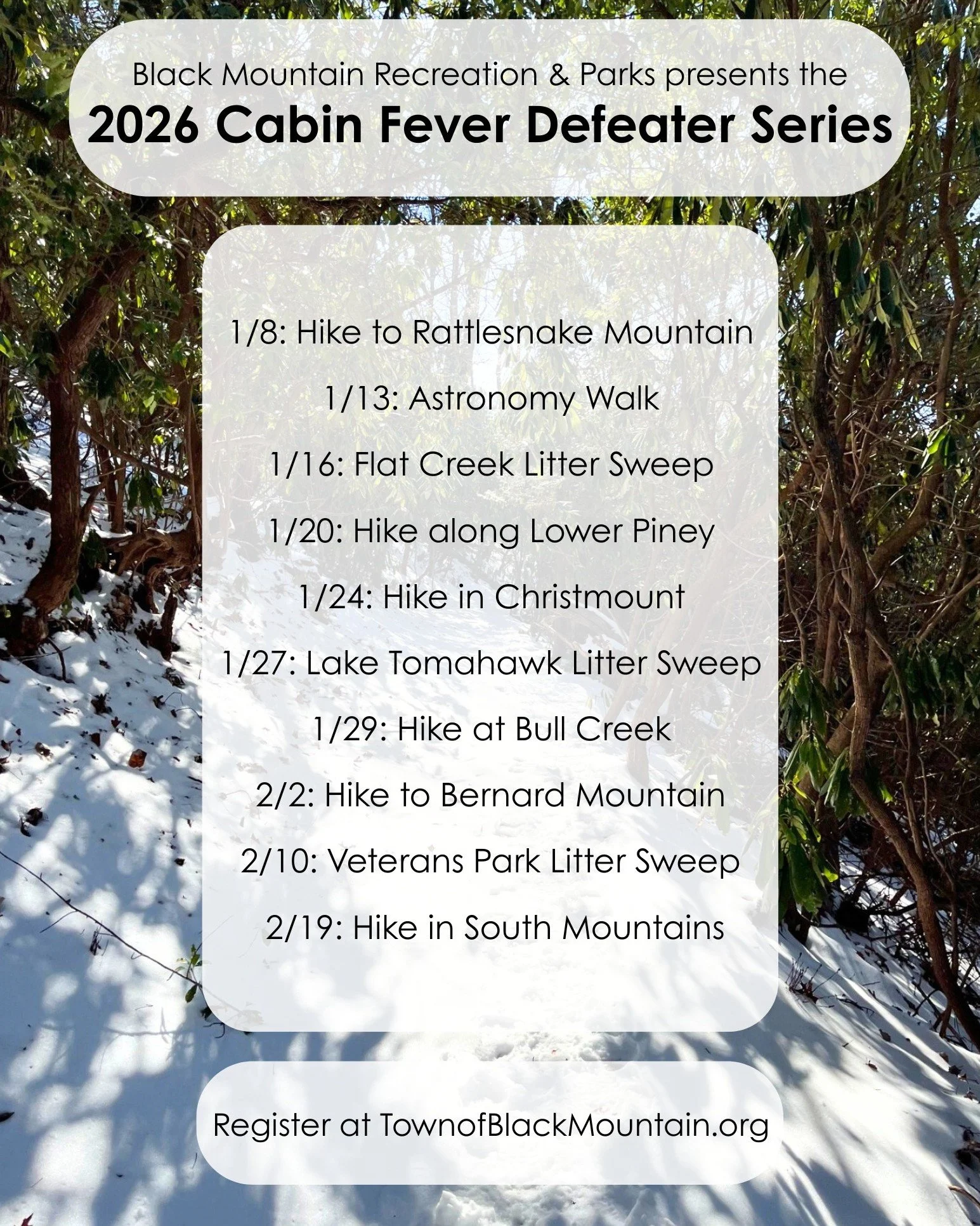 Black Mountain Recreation & Parks’s 2026 Cabin Fever Defeater Series is designed to help you get outside, meet like-minded neighbors, and rediscover how good winter movement can feel. This year's series includes six hikes, three litter sweeps, and an astronomy walk with local astronomer, Tommy Wilkinson. All programs are free, but registration is required. Learn more about each program and sign up here: https://bmrp.recdesk.com/Community/Program